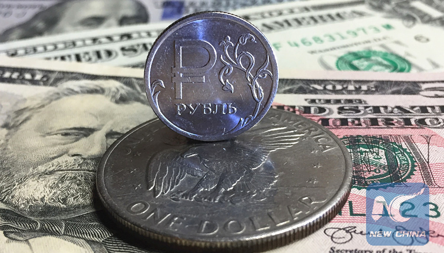 A Russian ruble coin is pictured with U.S. dollar bills and a one dollar coin in Moscow, on August 23, 2018. (AFP PHOTO)