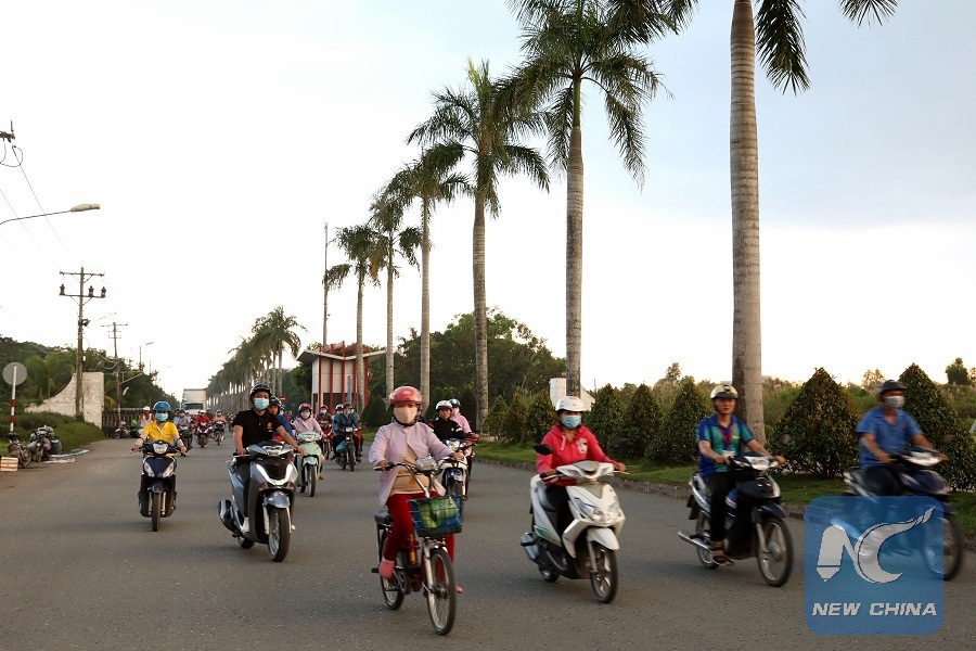 Photo taken on Oct. 26, 2018 shows motorbike commuters leave for home outside the entrance of Long Jiang Industrial Park in Tien Giang province, Vietnam. (Xinhua/Wang Di)