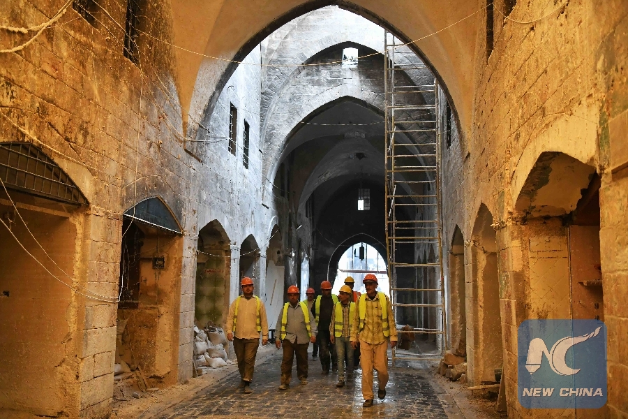 Workers carries out the rehabilitation work at the Souk al-Saqatiyya in Aleppo, northern Syria, on Dec. 19, 2018. (Xinhua/Ammar Safarjalani)
