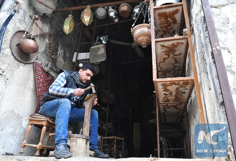 A Syrian coppersmith works in his shop at the Al-Nahhasin Souk, a marketplace specialized in selling handmade copper products, in Aleppo, northern Syria, on Dec. 19, 2018. (Xinhua/Ammar Safarjalani)