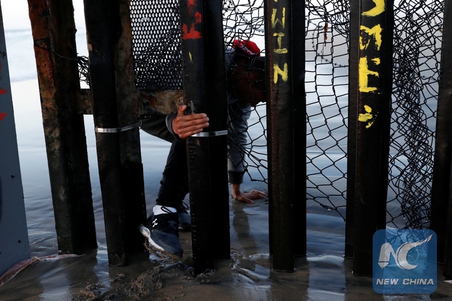 A migrant, part of a caravan of thousands from Central America trying to reach the United States, crawls through a gap in the border wall to cross illegally from Mexico to the U.S., in Tijuana, Mexico, Dec. 13, 2018. (Xinhua/REUTERS)