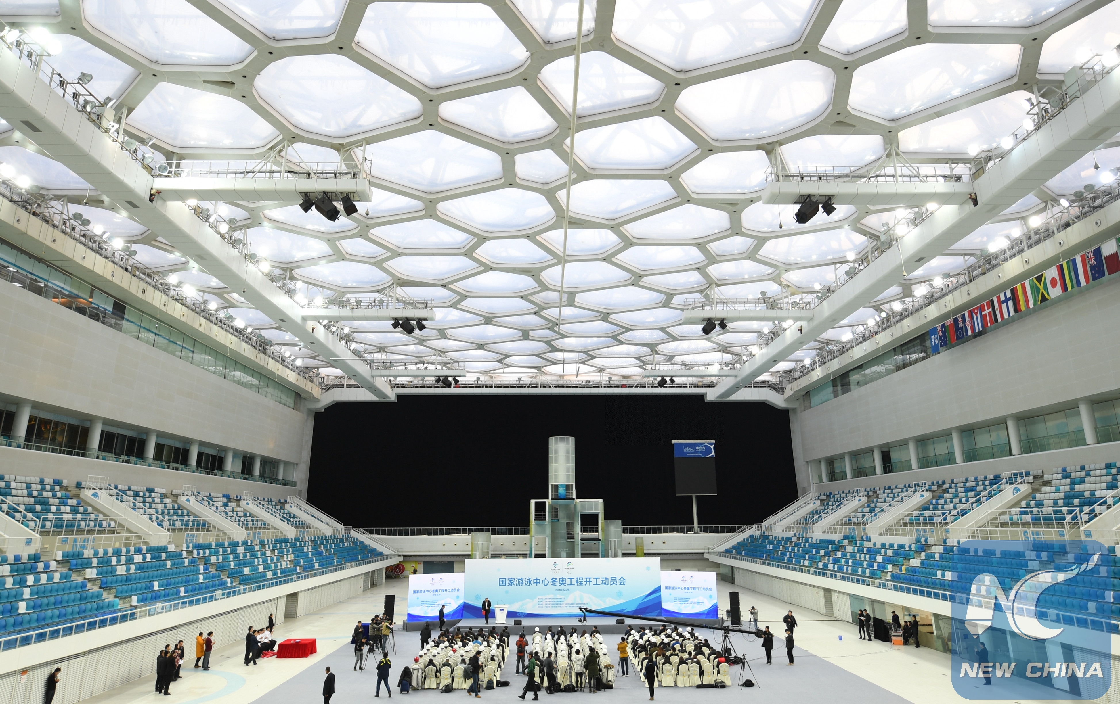Photo taken on Dec. 26, 2018 shows the general view of the rebuilding ceremony for the National Aquatics Center in Beijing, capital of China. (Xinhua/Zhang Chenlin)