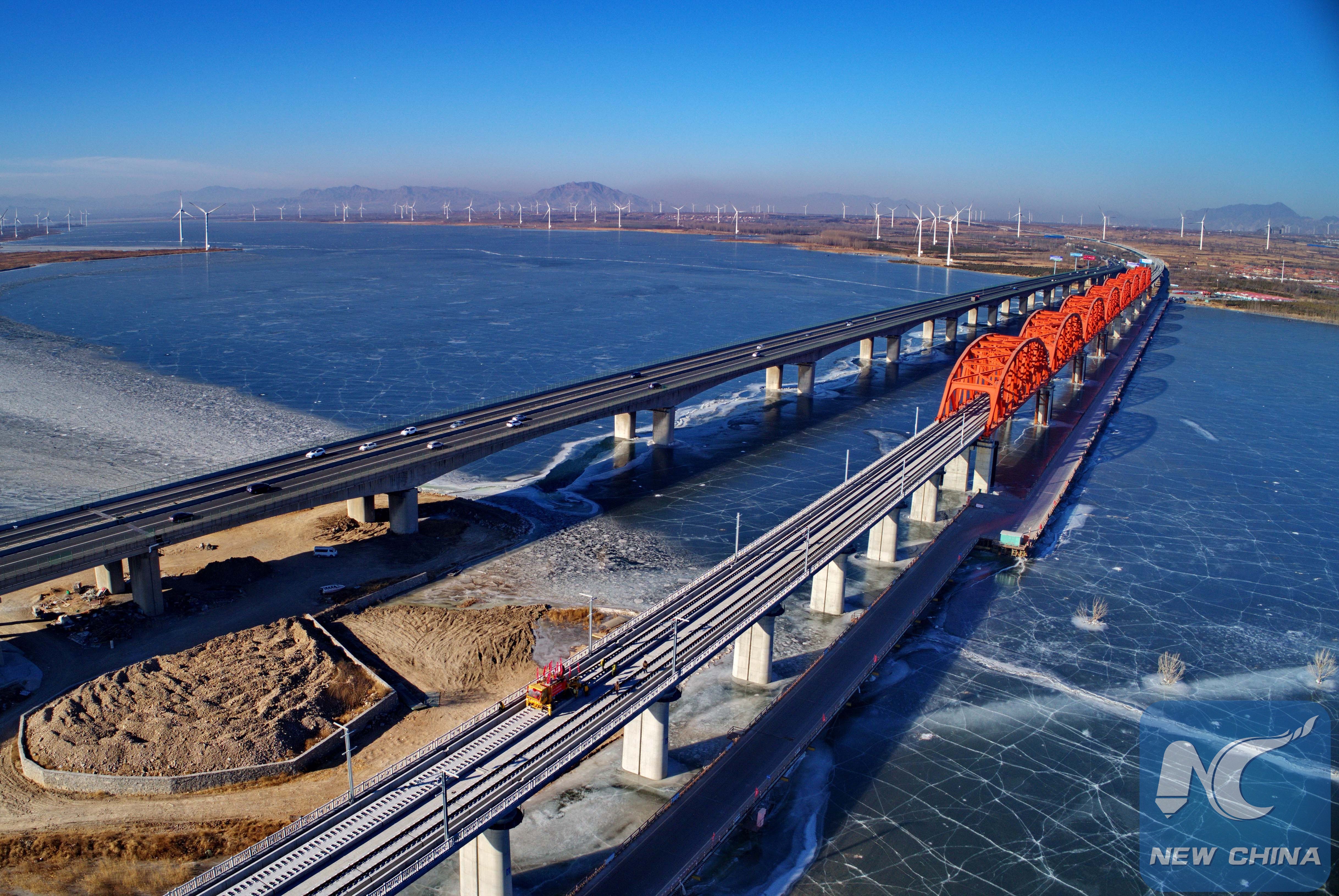 Aerial photo taken on Jan. 13, 2019 shows workers lay the tracks for the Beijing-Zhangjiakou high-speed railway line at Guanting reservoir grand bridge in north China's Hebei province. (Xinhua/Yang Shiyao)