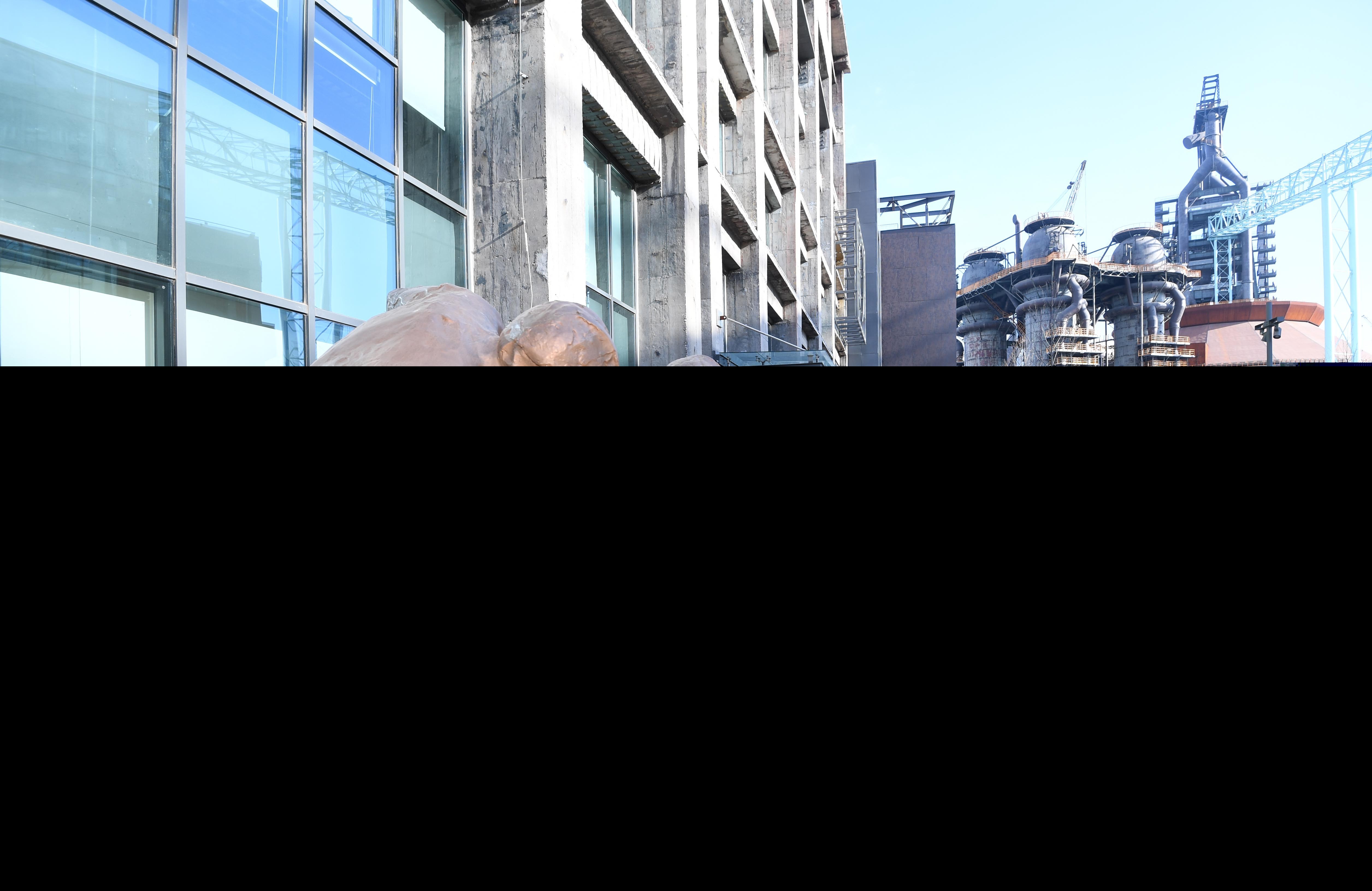 Photo taken on Jan. 22. 2019 shows a statue of ice hockey at the headquarters of Beijing 2022 Olympic Games Organizing Committee in Shougang Industrial Park, Beijing. (Xinhua/Chen Yehua)