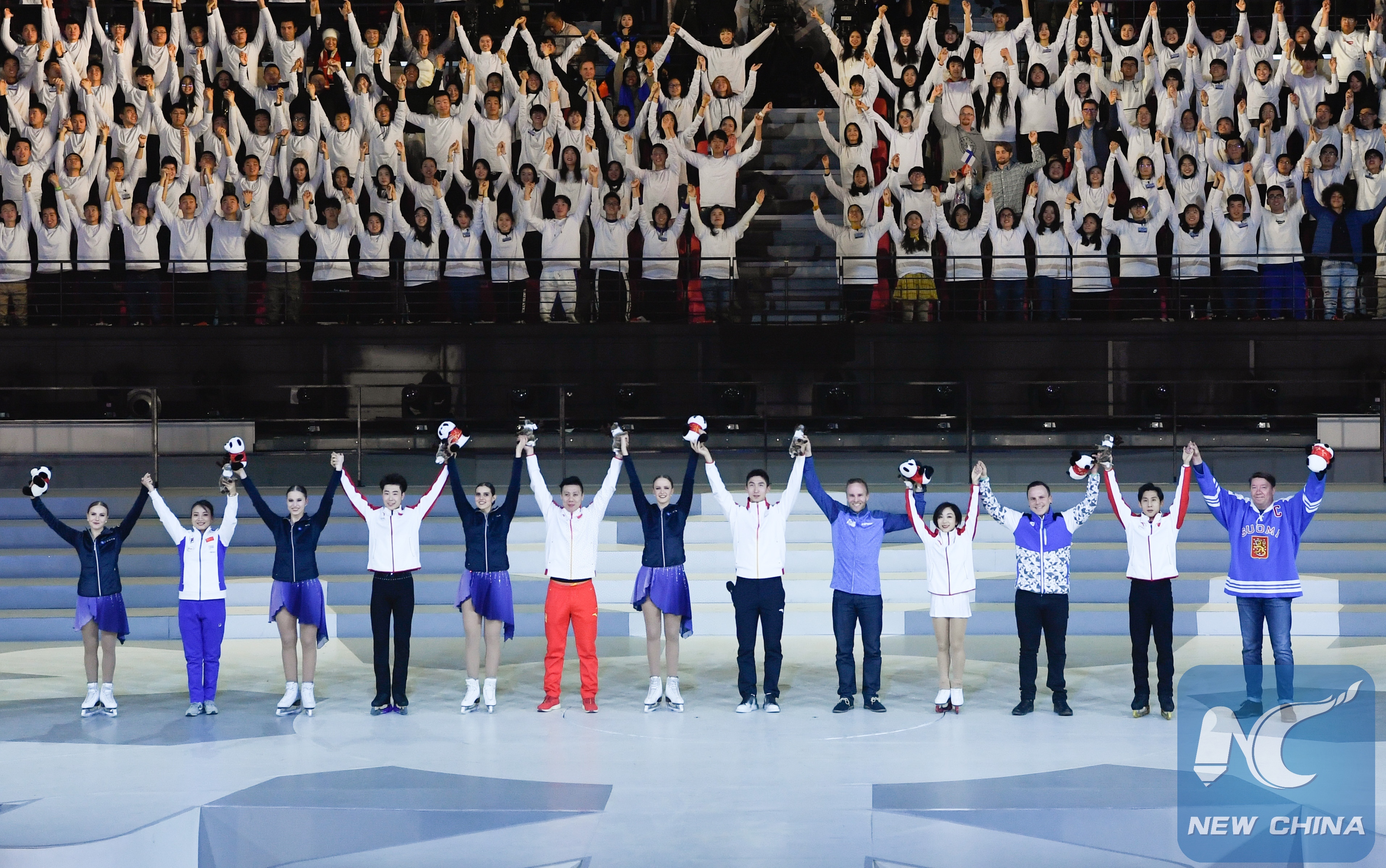 Photo taken on Jan. 15, 2019 shows the representatives to China and Finland greet audience during the opening ceremony of the China-Finland Year of Winter Sports in Beijing, capital of China. (Xinhua/Shen Hong)