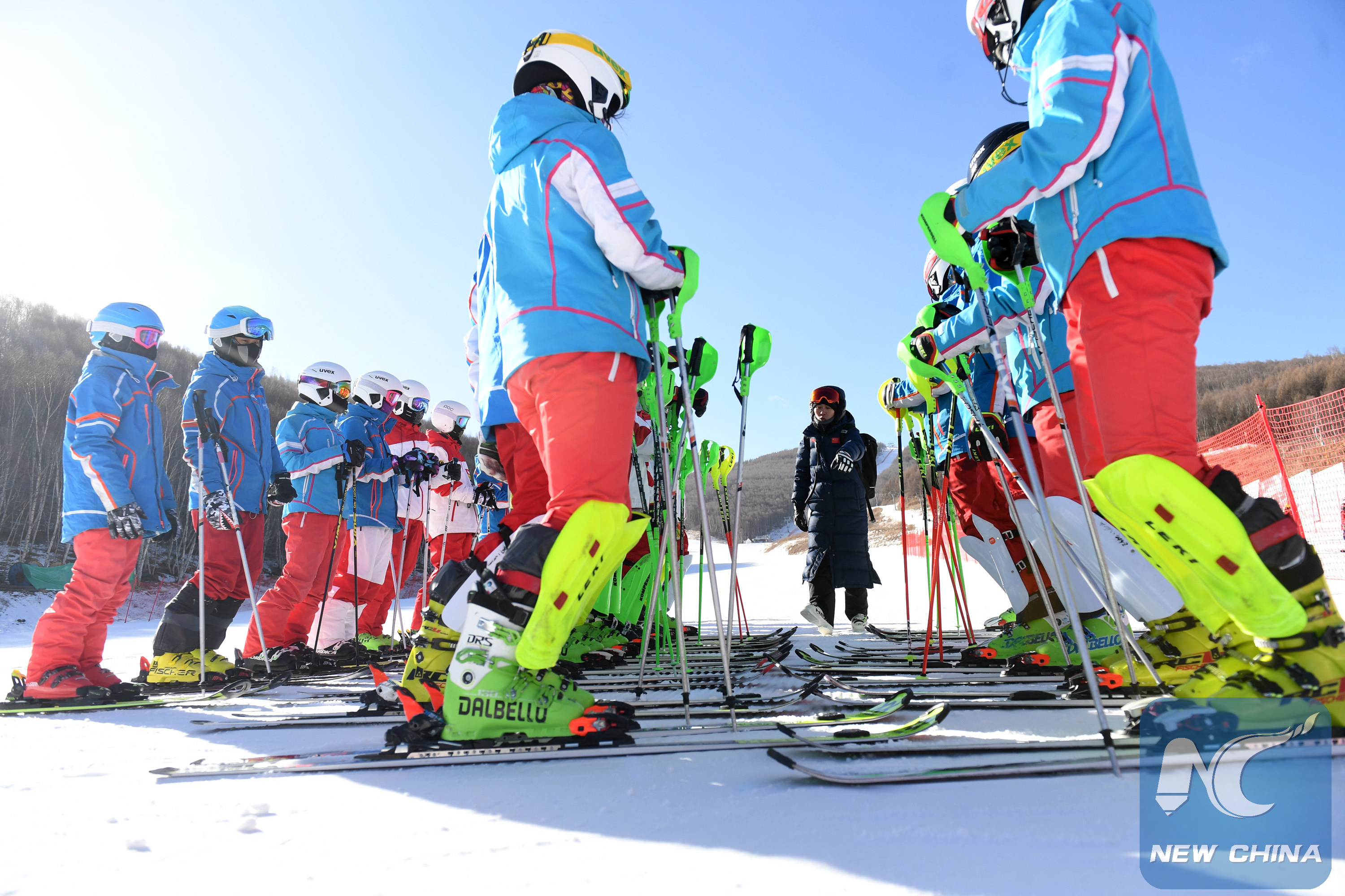 Photo taken on Dec. 4, 2018 shows coach Liu Yang (C) giving instructions while students warming up before skiing in Chongli of Zhangjiakou, north China's Hebei province. (Xinhua/Li Jundong)