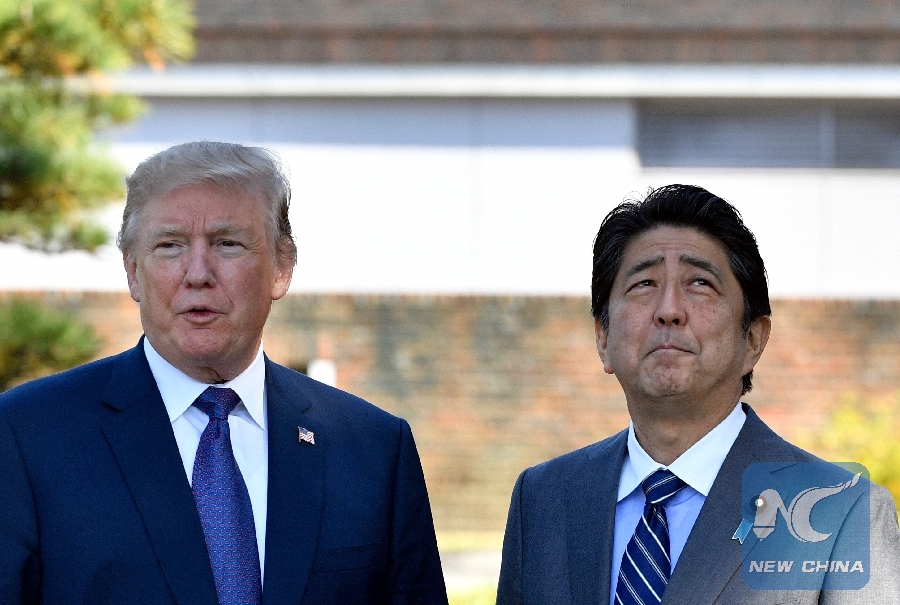 File Photo: U.S. President Donald Trump (L) meets with Japanese Prime Minister Shinzo Abe upon his arrival at the Kasumigaseki Country Club in Kawagoe, near Tokyo, Japan, Nov. 5, 2017.(Xinhua)