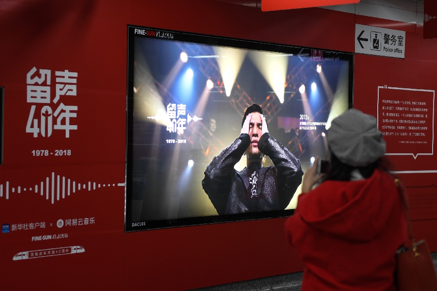 A passenger looks at a poster of a music theme photo exhibition at the Ding'an Road Station of Hangzhou Metro Line 1 in Hangzhou, east China's Zhejiang Province, Dec. 3, 2018. (Xinhua/Huang Zongzhi)