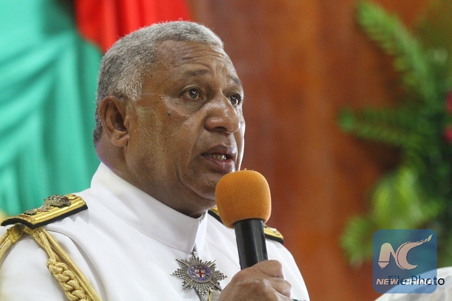 The file photo shows Fijian Prime Minister Voreqe Bainimarama speaks as he officially hands over the commander post to Brigadier General Mosese Tikoitoga at the Queen Elizabeth Barracks in Suva, Fiji, March 5, 2014. (Xinhua/Michael Yang)