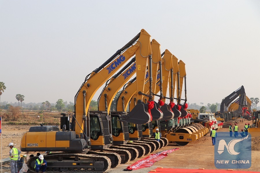 Photo taken in Kampong Speu, Cambodian on March 22, 2019 shows construction machineries line up during the groundbreaking ceremony of the expressway connecting capital Phnom Penh to the southwestern seaport province of Preah Sihanoukof. (Xinhua/Mao Pengfei)