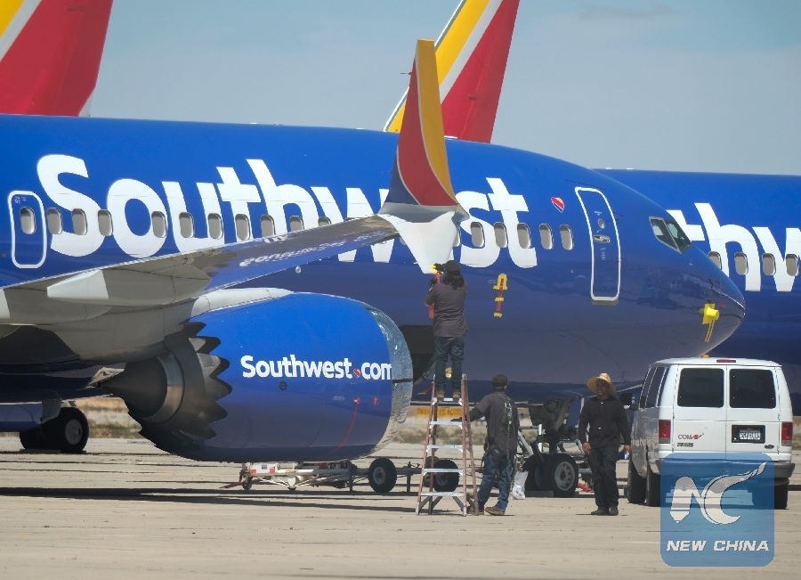 People work on a Southwest Airlines Boeing 737 Max aircraft at the Southern California Logistics Airport, also known as Victorville Airport, in Victorville, California, the United States, on March 27, 2019. (Xinhua/Zhao Hanrong)