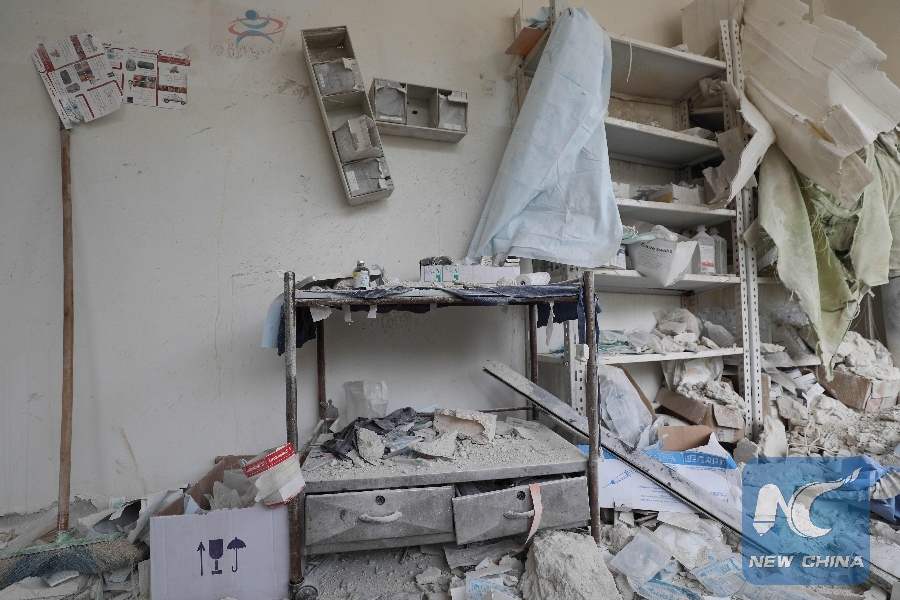 A picture taken on April 30, 2019 shows a medical room covered in rubble and debris following reported shelling by the Syrian government in the Syrian town of Hbeit in the south of Idlib province. (Xinhua/AFP)