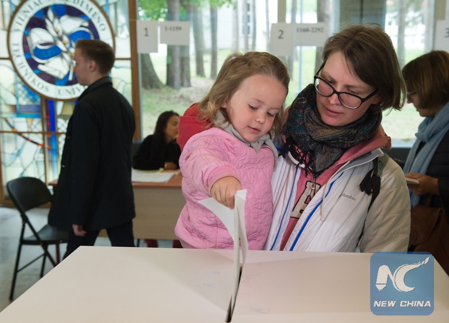 A girl casts her mother's ballot at a polling station in Vilnius, Lithuania, May 26, 2019. The presidential runoff kicked off in Lithuania on Sunday with former Finance Minister Ingrida Simonyte and economist Gitanas Nauseda contending for the country's top job. European Parliament (EU) elections in Lithuania were held alongside the runoff. (Xinhua/Alfredas Pliadis)