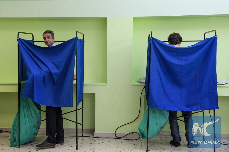 Greek main opposition New Democracy party leader Kyriakos Mitsotakis (L) is seen at a polling station in Athens, Greece on May 26, 2019. Voters in Greece cast their ballots on Sunday in elections to the European Parliament (EP). (Xinhua/Michalis Karagiannis)