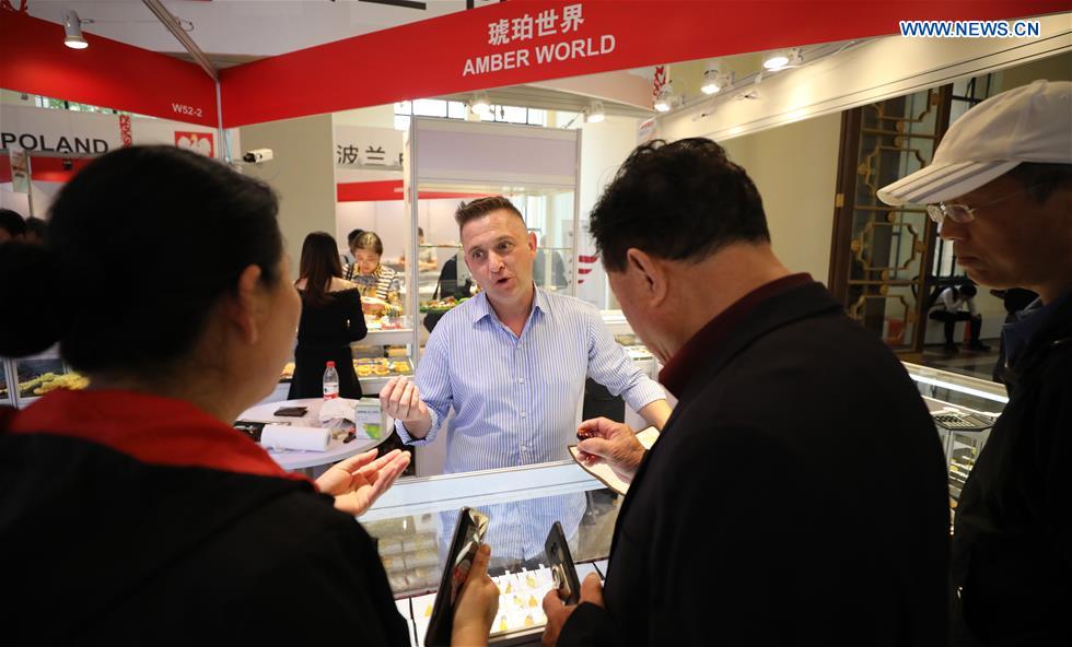 An exhibitor (C) from Poland introduces jewelry products to visitors in Shanghai, east China, May 31, 2019. The Belt and Road Brand Expo 2019 kicked off at Shanghai Exhibition Center in Shanghai Friday. (Xinhua/Fang Zhe)