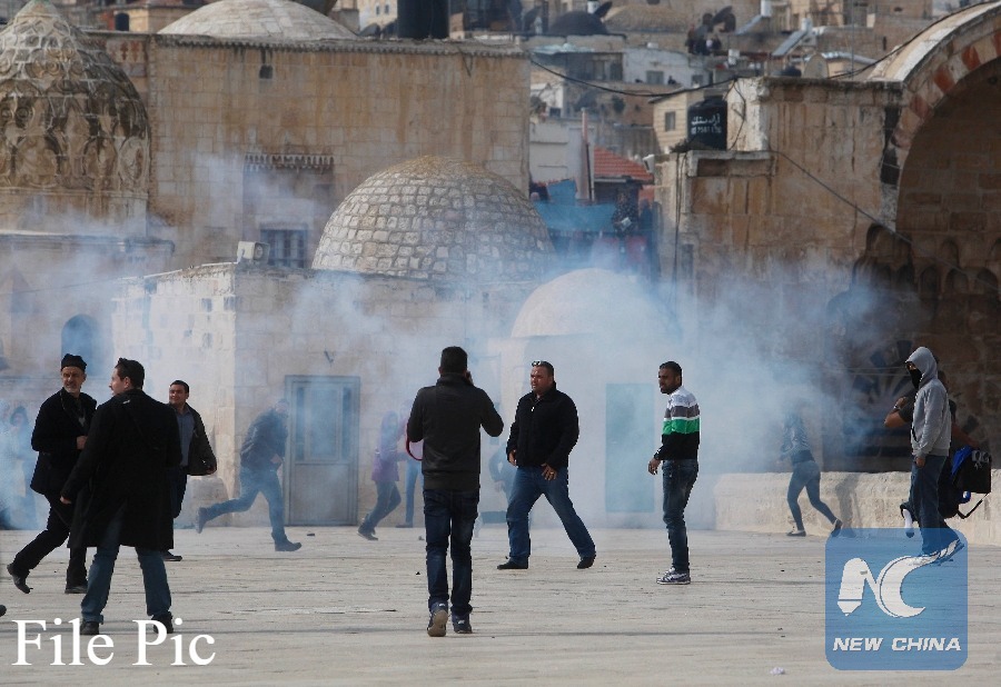 Palestinian young men clash with Israeli riot policemen in a conflict following Friday prayers at Jerusalem's al-Aqsa Mosque compound, on Feb. 7, 2014. (Xinhua File photo)