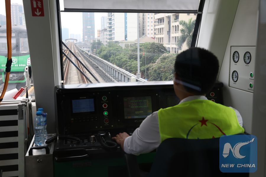 A Vietnamese driver operates a train during the operational drill of Cat Linh-Ha Dong urban railway project in Hanoi, capital of Vietnam, June 7, 2019. (Xinhua/Wang Di)