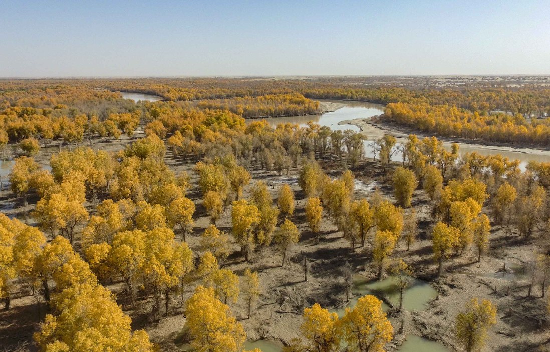 Forests of desert poplar are seen in Yuli County, northwest China's Xinjiang Uygur Autonomous Region, Oct. 25, 2018. (Xinhua)