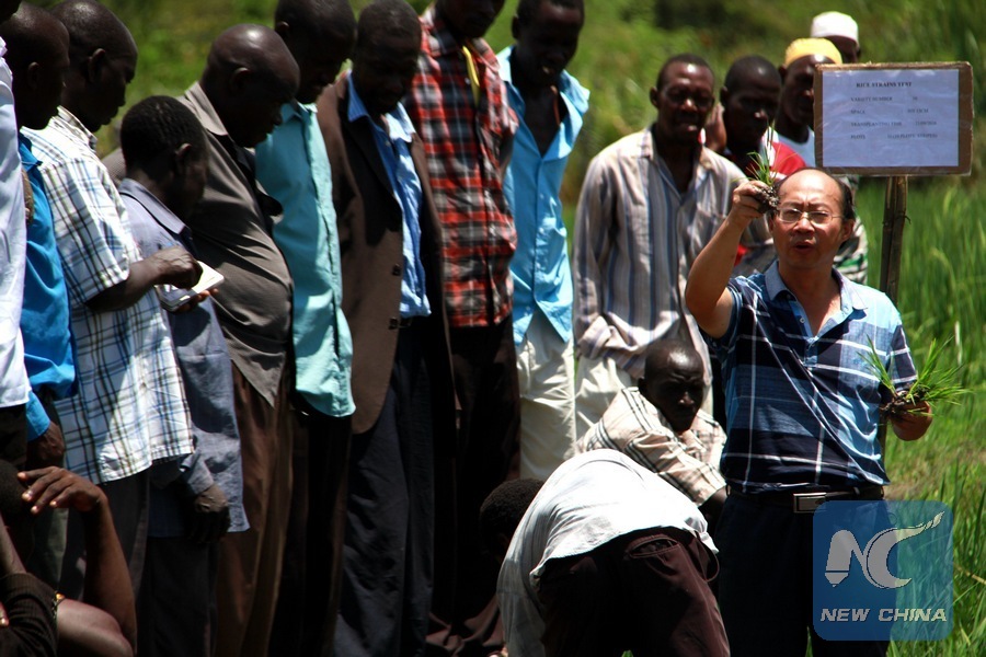 File photo shows a Chinese cereals expert shows rice farmers in the eastern Ugandan district of Budaka how to transplant the high yielding Chinese hybrid rice, Oct. 25, 2016. Chinese experts under an agreement between China, Uganda and UN's Food and Agriculture Organization are training farmers in better practices. The agreement is under the auspices of the South to South Cooperation program established in 2009 to help developing countries share knowledge and expertise so that all can benefit from innovations and good practices that have been tried and tested in countries facing similar conditions and challenges. (Xinhua/Ronald Ssekandi)