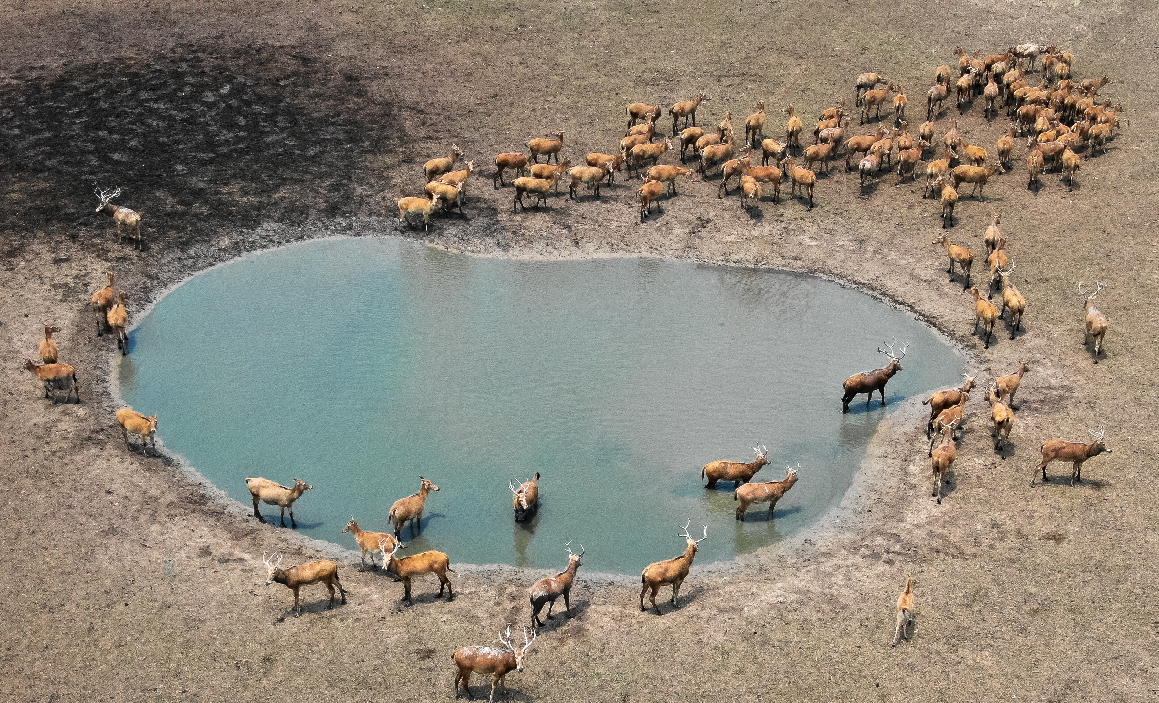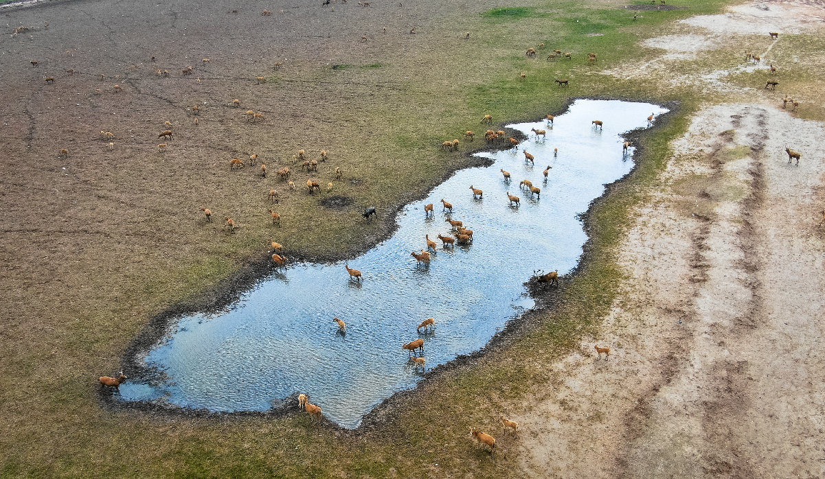 Aerial photo taken on June 28, 2019 shows milu deer gathering around a pond in Dafeng Milu National Nature Reserve in east China's Jiangsu Province. (Xinhua/Li Xiang)