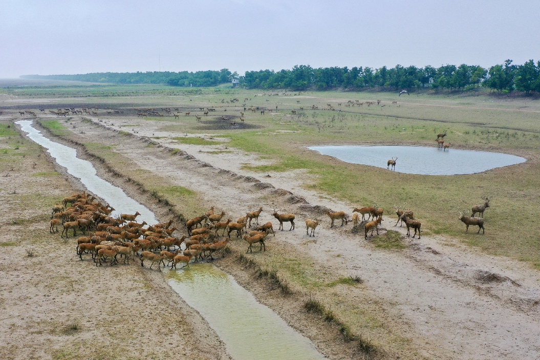 Aerial photo taken on June 28, 2019 shows milu deer gathering around ponds in Dafeng Milu National Nature Reserve in east China's Jiangsu Province.(Xinhua/Li Xiang)