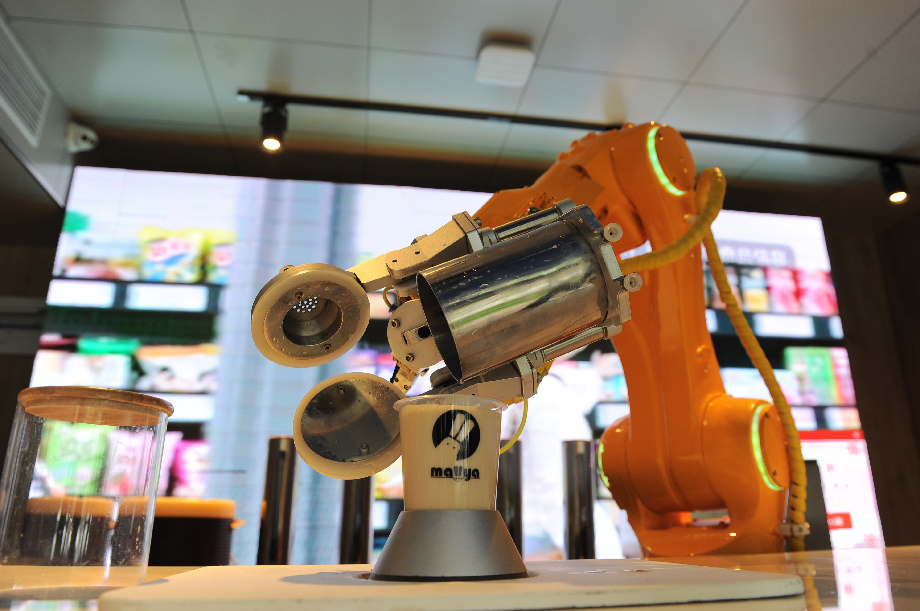 A robot is seen making a drink at Changyang Campus in Yangpu district, east China's Shanghai, June 21, 2019. (Xinhua/Ren Pengfei)