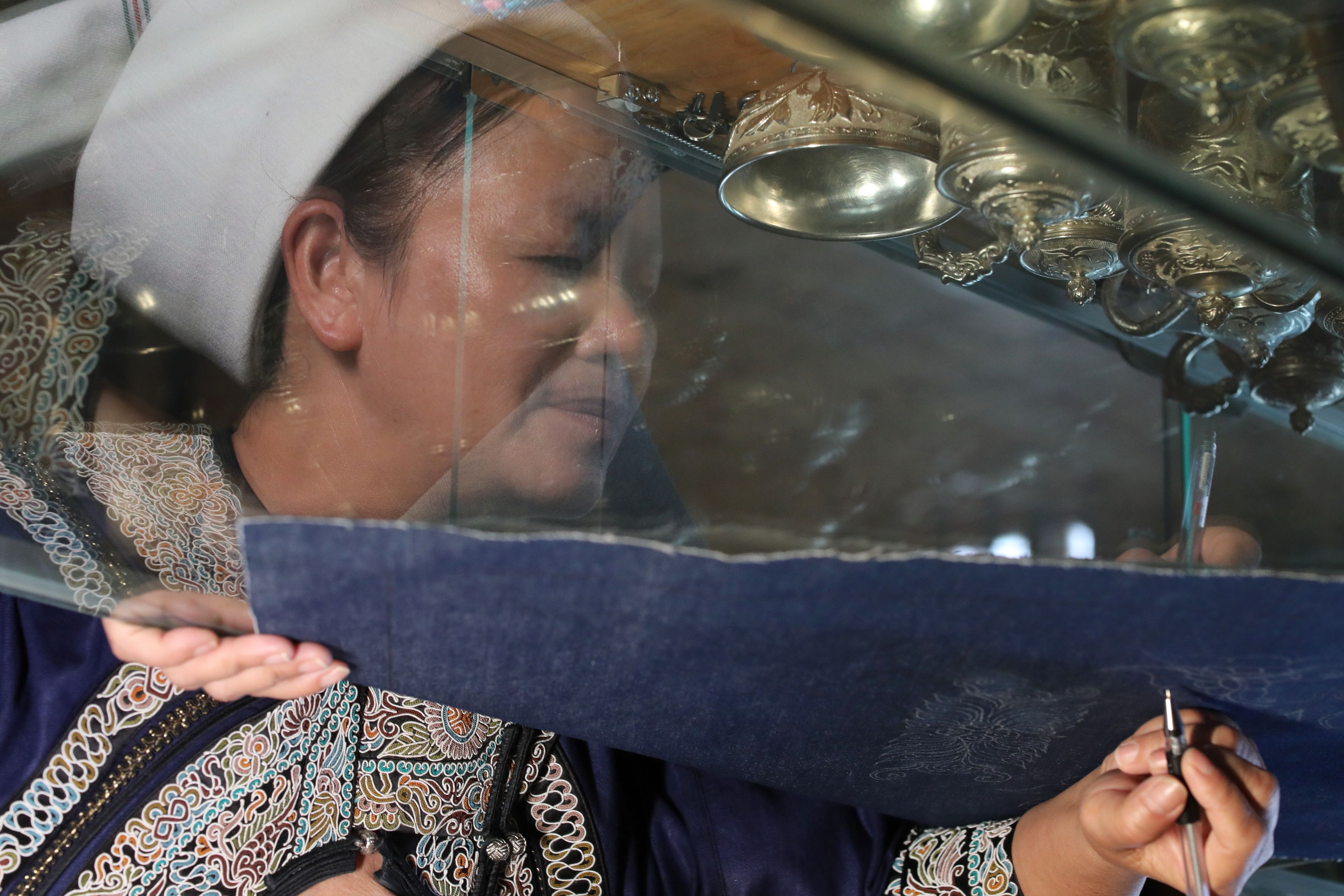 Wei Taohua is pictured in this inverted image while drawing needlework sketches for the traditional horse tail embroidery. (Xinhua/Ou Dongqu)
