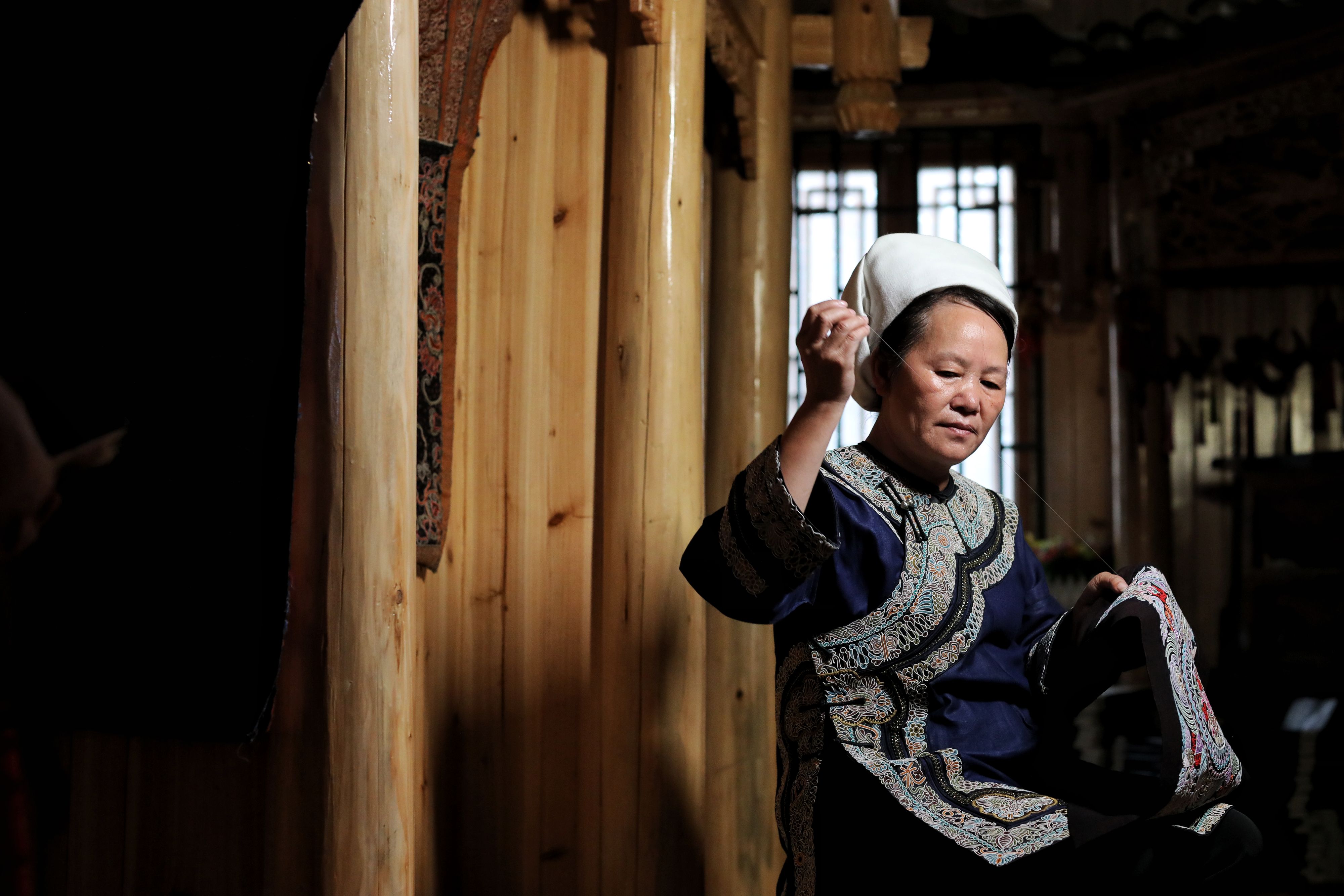 Wei Taohua, an embroiderer of the Shui ethnic group, draws needlework sketches for the traditional horse tail embroidery in Sandu Shui Autonomous County, southwest China's Guizhou Province, July 6, 2019. (Xinhua/Ou Dongqu)