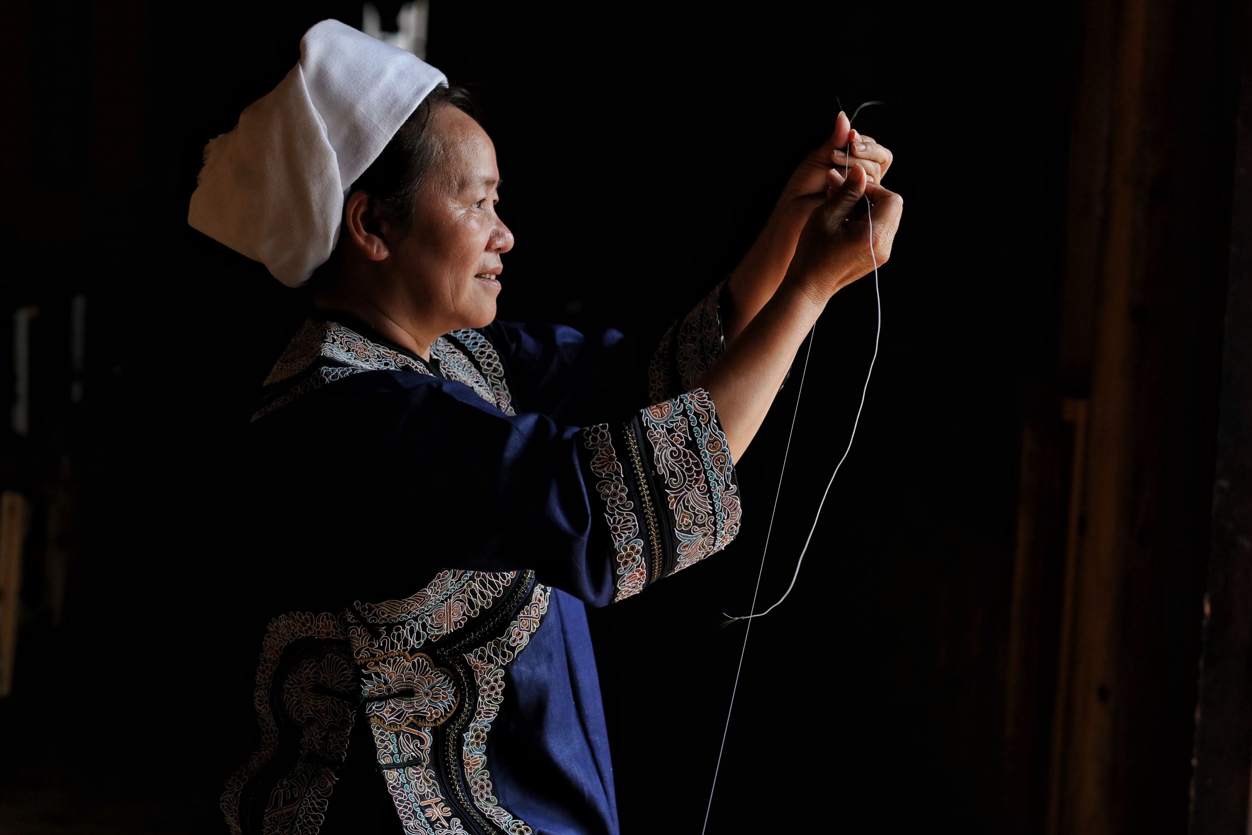 Wei Taohua picks horse tail fibers to make sewing threads for the traditional horse tail embroidery. (Xinhua/Ou Dongqu)