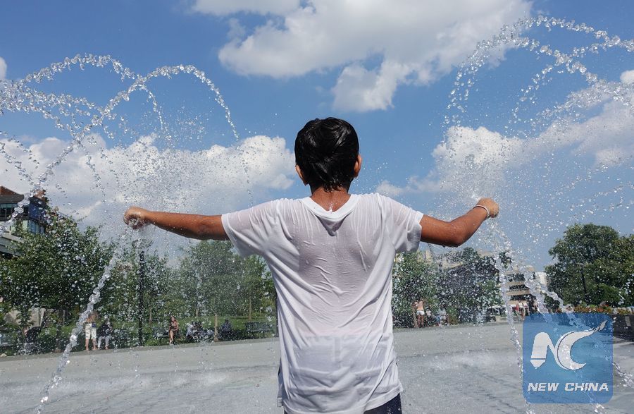 A kid plays at a fountain at Georgetown Waterfront Park in Washington D.C., the United States, on July 20, 2019. The temperature was as high as 36 degrees Celsius in the U.S. capital amid an excessive heat wave. (Xinhua/Liu Jie)