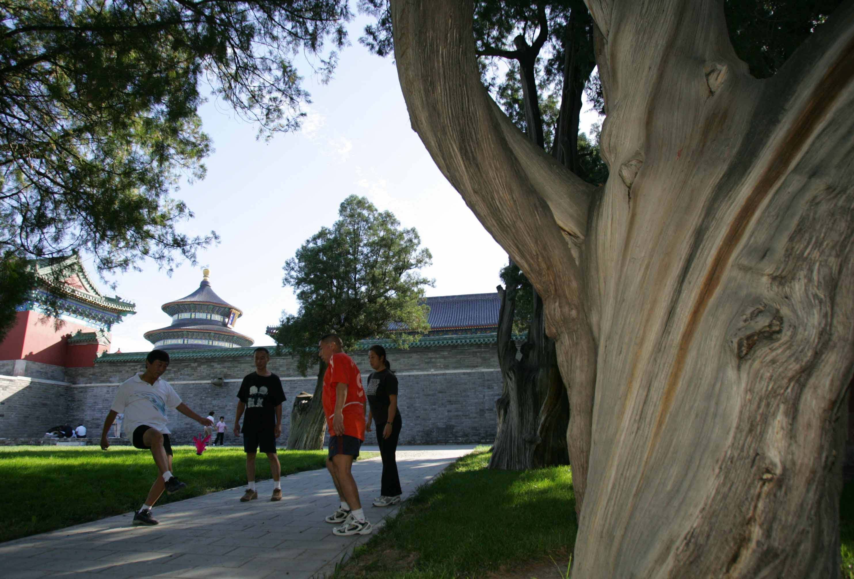 Photo taken on Sept. 28, 2007 shows that people are doing exercises beside the ancient trees in the Temple of Heaven in Beijing. The park held an ancient cypress culture exhibition to raise the public awareness of protecting ancient trees.(Xinhua/Lu Xin)