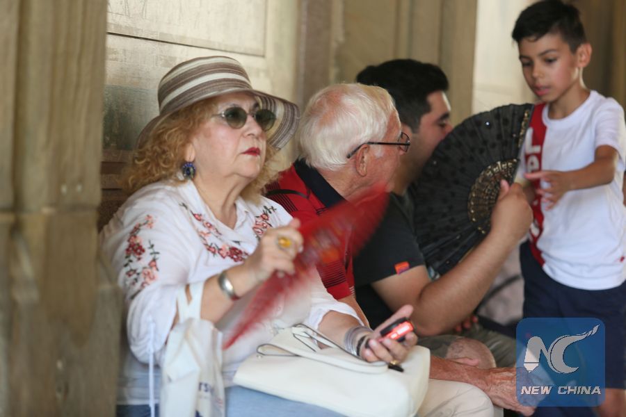 People use folding fans to cool themselves off in New York City, the United States, July 21, 2019. The highest temperature hit 36 degrees Celsius in New York City on Sunday as a result of a heat wave. (Xinhua/Zhang Fengguo)