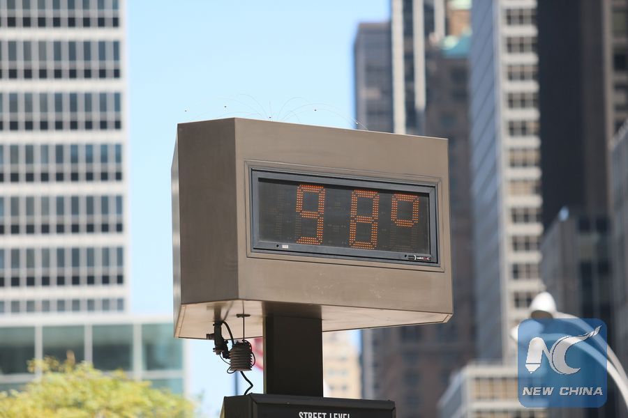 The current temperature is displayed on a board in New York city, the United States, on July 21, 2019. The highest temperature hit 36 degrees Celsius in New York City on Sunday as a result of a heat wave. (Xinhua/Zhang Fengguo)