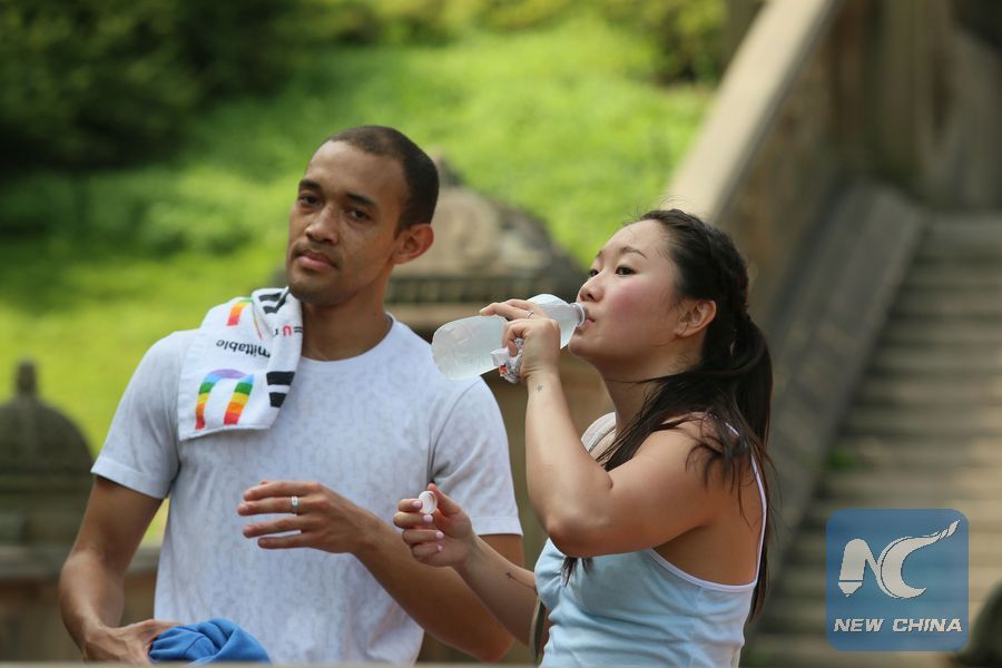 A woman drinks ice water in New York City, the United States, July 21, 2019. The highest temperature hit 36 degrees Celsius in New York City on Sunday as a result of a heat wave. (Xinhua/Gu Xingnan)