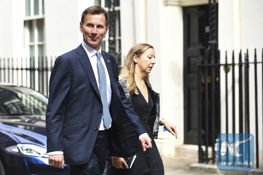 British Foreign Secretary Jeremy Hunt (L) arrives at Downing Street for a government's emergency committee Cobra meeting in London, Britain, on July 22, 2019. (Xinhua/Alberto Pezzali)