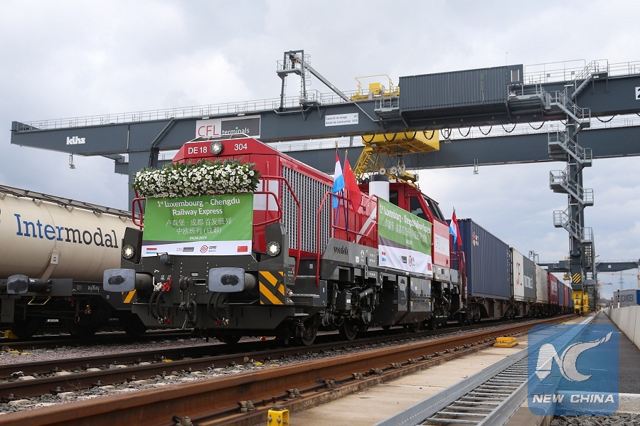 The first Luxembourg-Chengdu freight train starts at a cargo train station in Dudelange, Luxembourg, April 4, 2019. (Xinhua/Zheng Huansong)