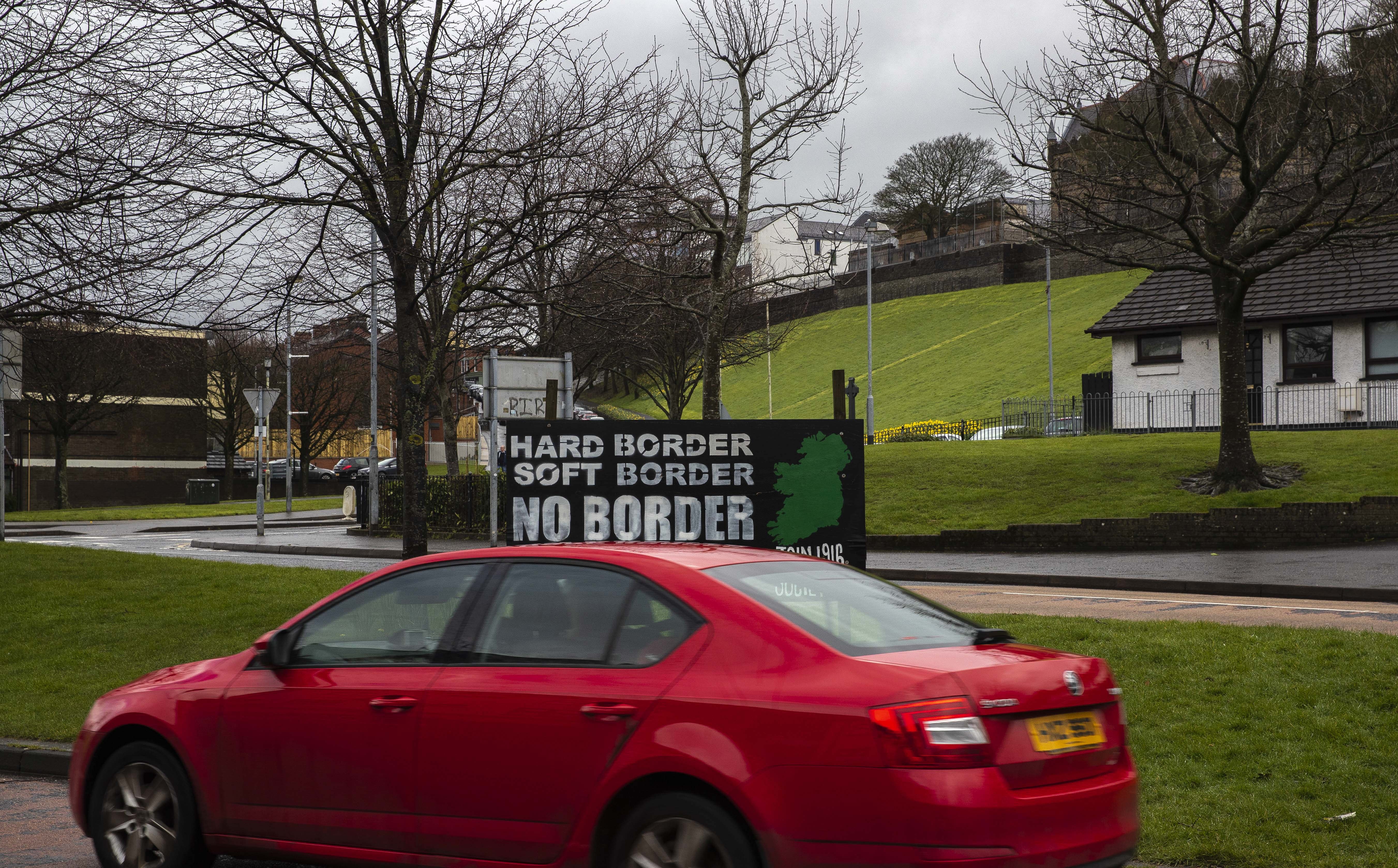 A car passes by a sign saying "Hard Border, Soft Border, No Border" in Derry, a border city in Northern Ireland, the United Kingdom.(Xinhua/Han Yan)