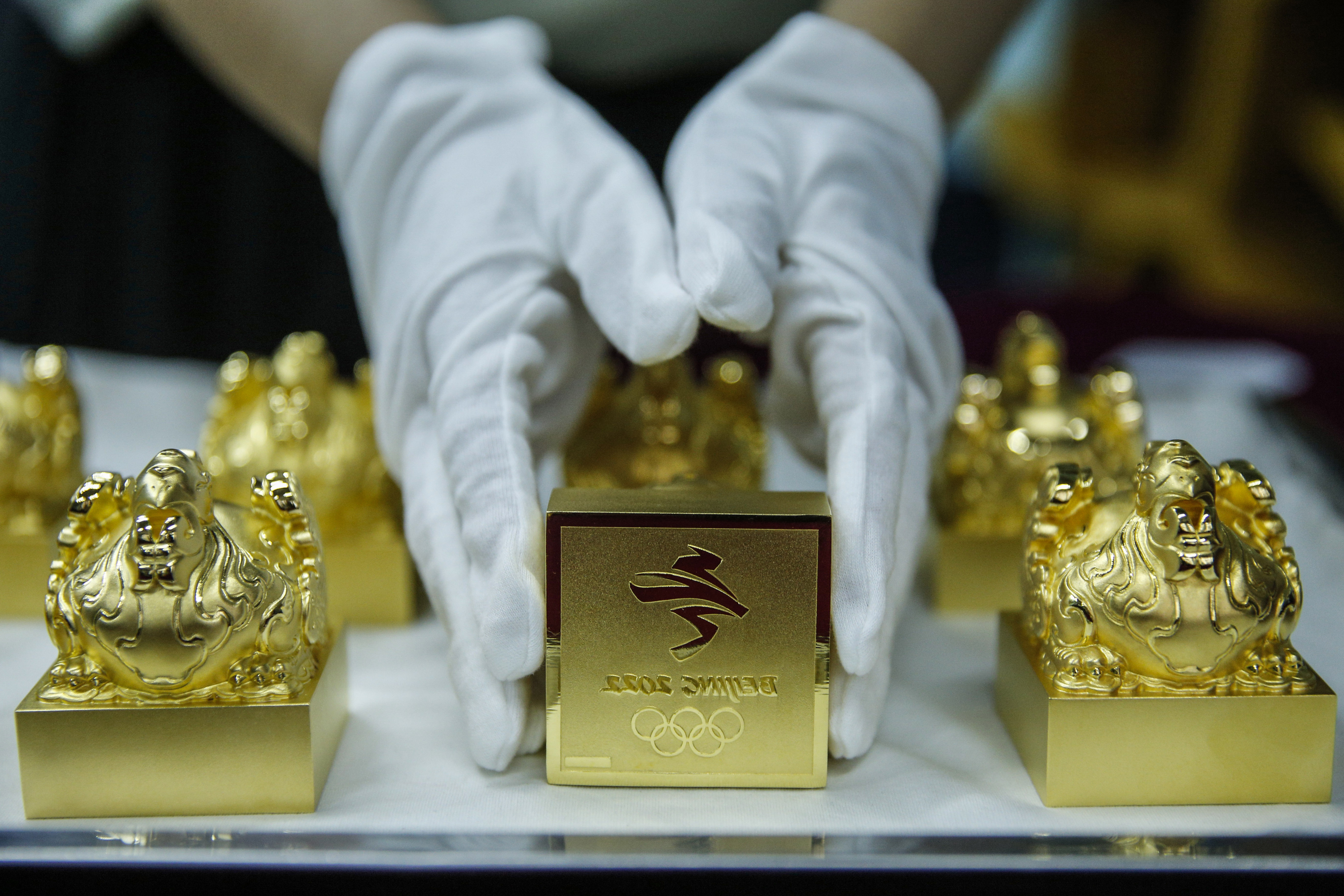 Emblem seals made of Hetian greenish white jade and gold for Beijing 2022 are released on July 31, 2019. (Xinhua/Zhang Yuwei)
