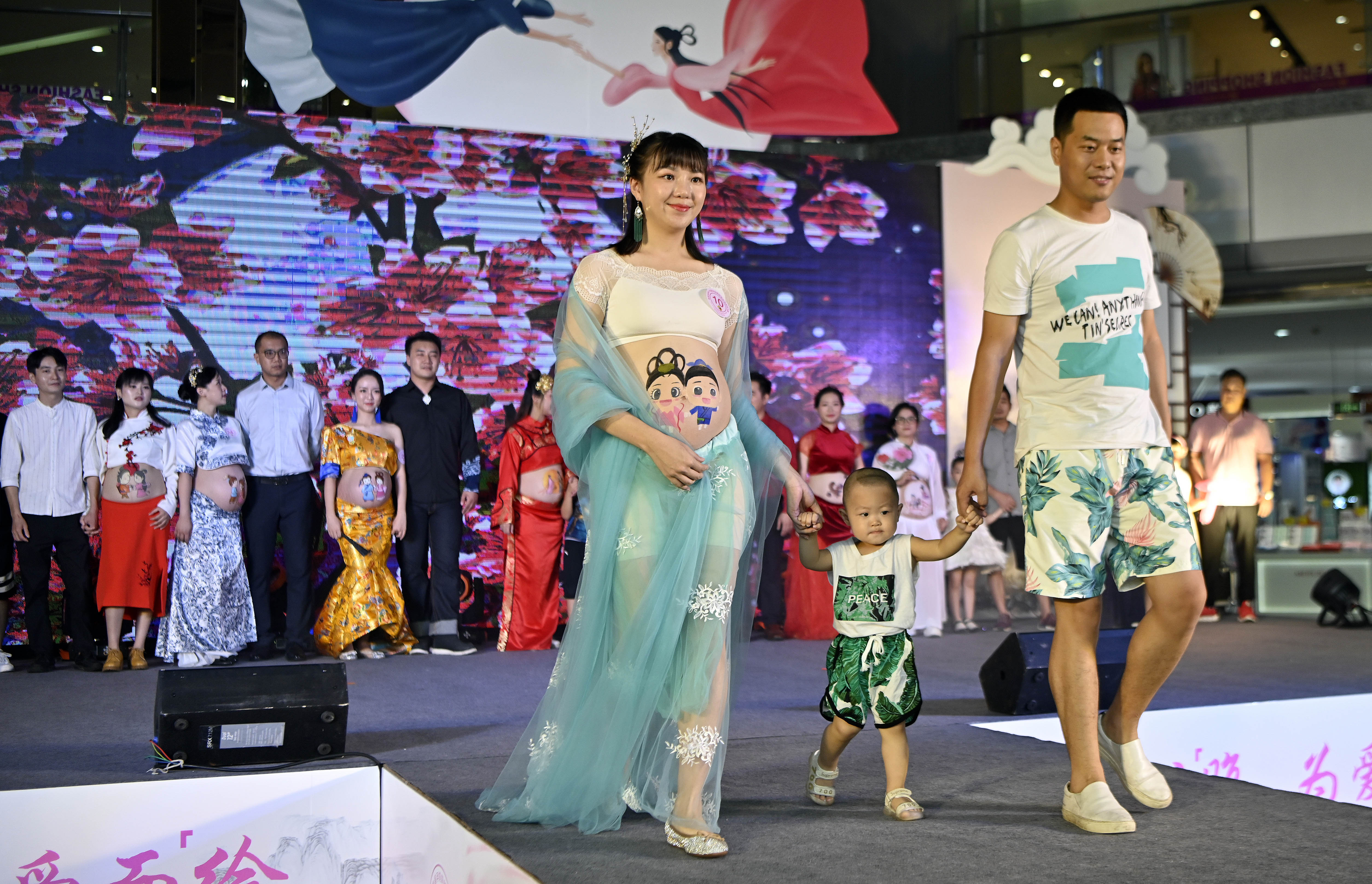 A pregnant woman performs on the stage with her husband and son during a belly fashion contest in Haikou, south China's Hainan Province, Aug. 4, 2019. (Xinhua/Guo Cheng)