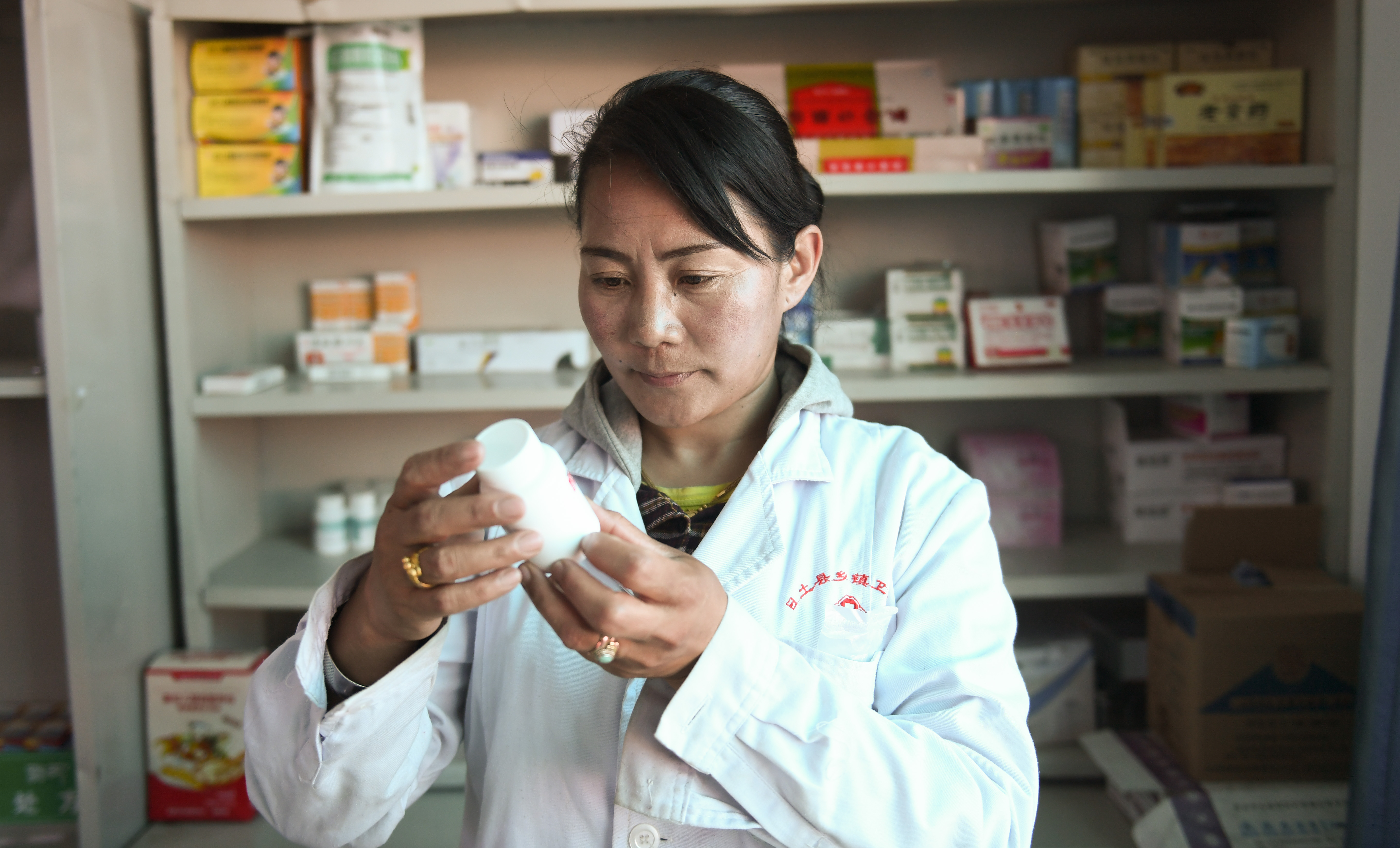 Village doctor Zhoima examines the medicine at her clinic in Wuqang Village of Dongmar Township in Rutog County, Ngari Prefecture, southwest China's Tibet Autonomous Region, Aug. 3, 2019. (Xinhua/Jigme Dorje)