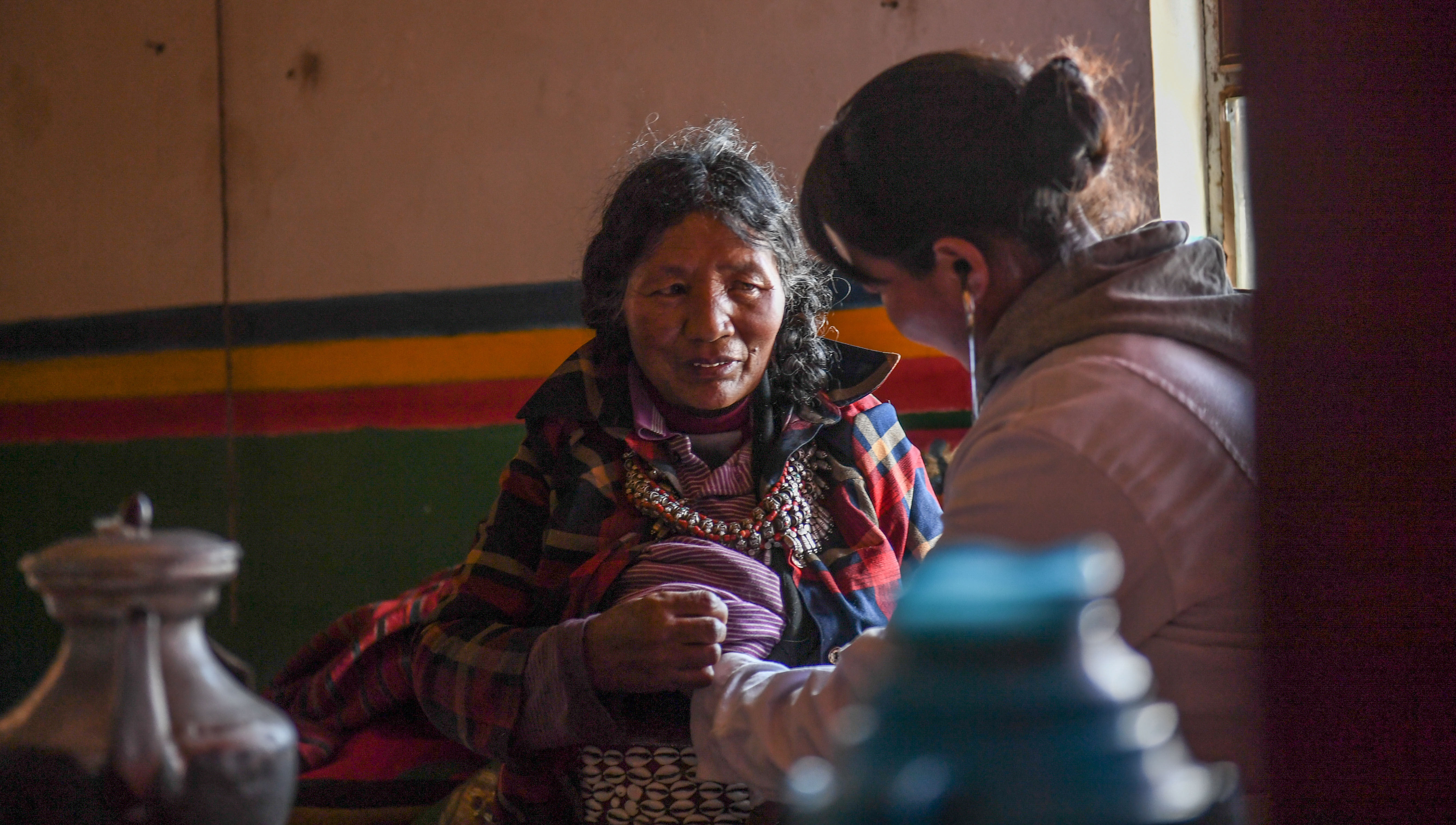 Zhoima (R) conducts a medical checkup for a villager at the health room in Wuqang Village, SW China's Tibet Autonomous Region, Aug. 3, 2019. (Xinhua/Jigme Dorje)