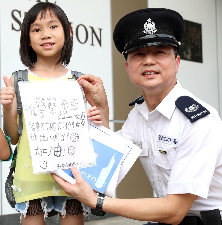 "The police have been working really hard to safeguard social order. We came here to show our support," said a resident surnamed Chan, who visited Kwai Chung Police Station with his wife and son. The boy gave the police a hand-written card as a gift.