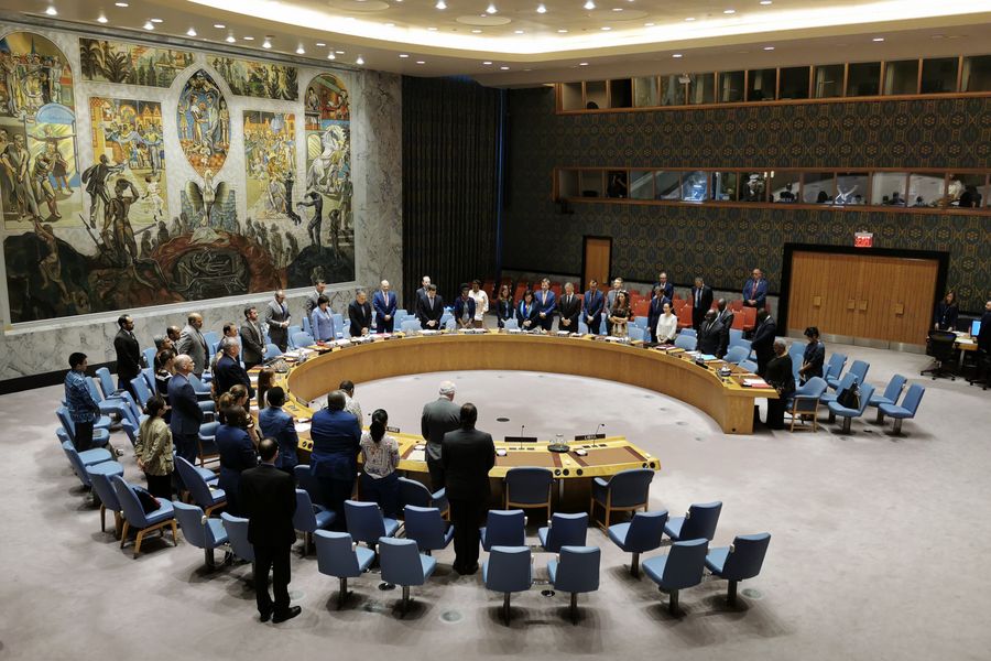 The United Nations Security Council observes a minute of silence to the three UN staff members killed in the Benghazi car bomb attack at the UN headquarters in New York, Aug. 10, 2019. (Xinhua/Li Muzi)