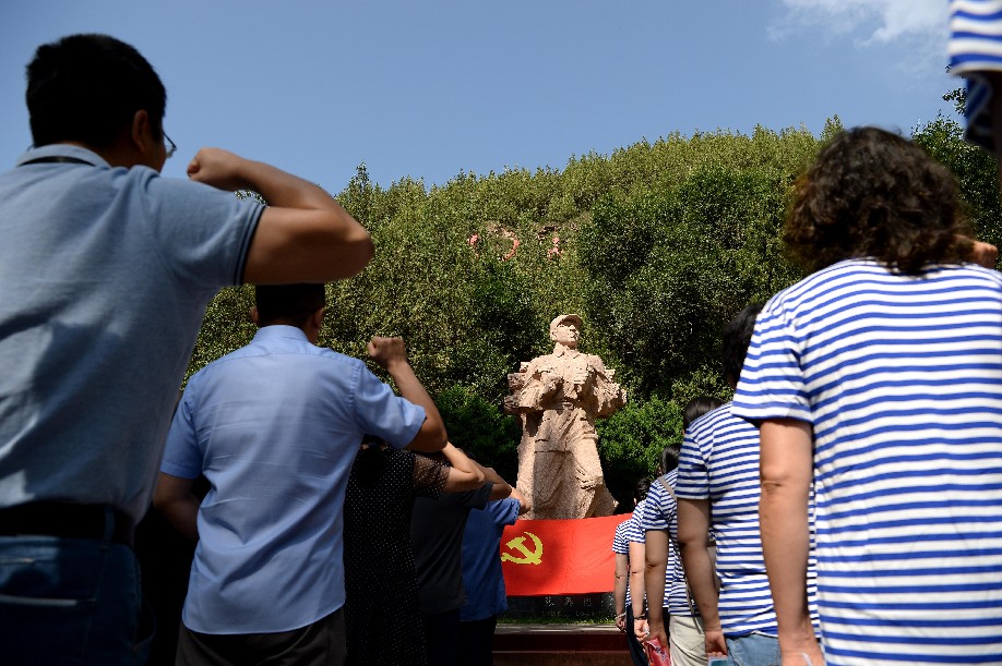 Visitors review the oath of the Communist Party of China in front of the memorial statue of Zhang Side in Yan'an, northwest China's Shaanxi Province, Aug. 1, 2019. (Xinhua/Liu Xiao)