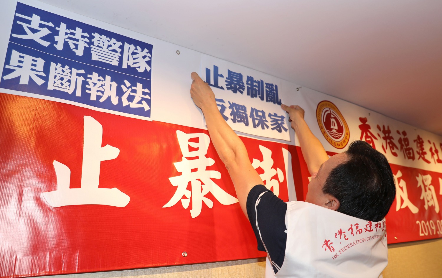 A staff member arranges the venue before a meeting during which representatives of the Hong Kong Federation of Fujian Associations express their support for the police force in Hong Kong, south China, Aug. 10, 2019. (Xinhua/Wu Xiaochu)