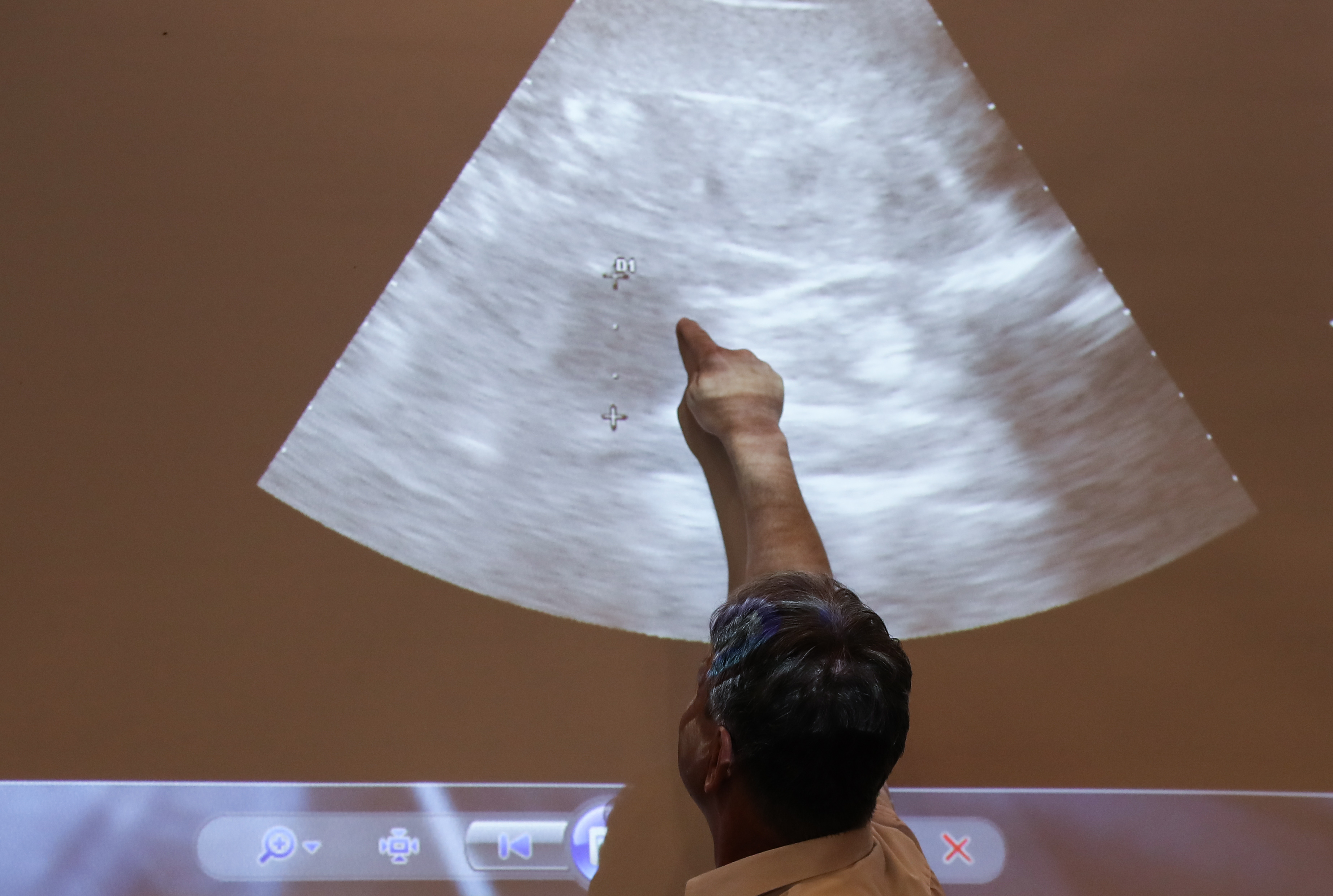 Thomas Hildebrandt, head of the reproduction management department at Germany's Leibniz Institute for Zoo and Wildlife Research, points the position of the embryo during a press conference at the Zoo Berlin in Berlin, capital of Germany, on Aug. 14, 2019.(Xinhua/Shan Yuqi)