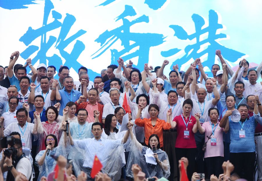 Over 470,000 people gathered on Saturday in a rally held at Tamar Park, Admiralty of Hong Kong, to voice out their demand for peace and stability in Hong Kong. Waving the Chinese national flag and the flag of the Hong Kong Special Administrative Region and holding signs written with slogans including "Stop Riots", "Anti-violence" and "Save Hong Kong", the crowd was enthusiastic and impassioned despite the rain.