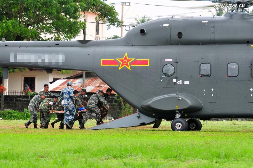 The Chinese People's Liberation Army (PLA)'s Z-8G rescue helicopter participates in the "Peace Train-2019" China-Laos humanitarian and medical joint rescue exercise in the northern suburbs of Lao capital Vientiane, Aug. 18, 2019. It is the first time for the Chinese helicopter to fly abroad to attend a joint health and logistic drill. (Xinhua/Zhang Jianhua)
