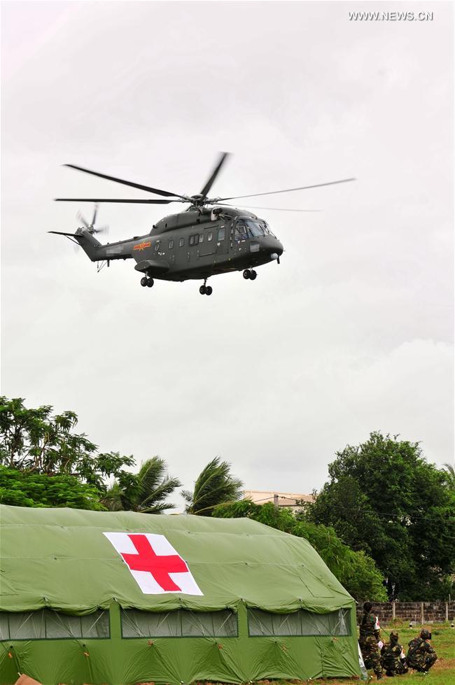 The Chinese People's Liberation Army (PLA)'s Z-8G rescue helicopter participates in the "Peace Train-2019" China-Laos humanitarian and medical joint rescue exercise in the northern suburbs of Lao capital Vientiane, Aug. 18, 2019. It is the first time for the Chinese helicopter to fly abroad to attend a joint health and logistic drill. (Xinhua/Zhang Jianhua)
