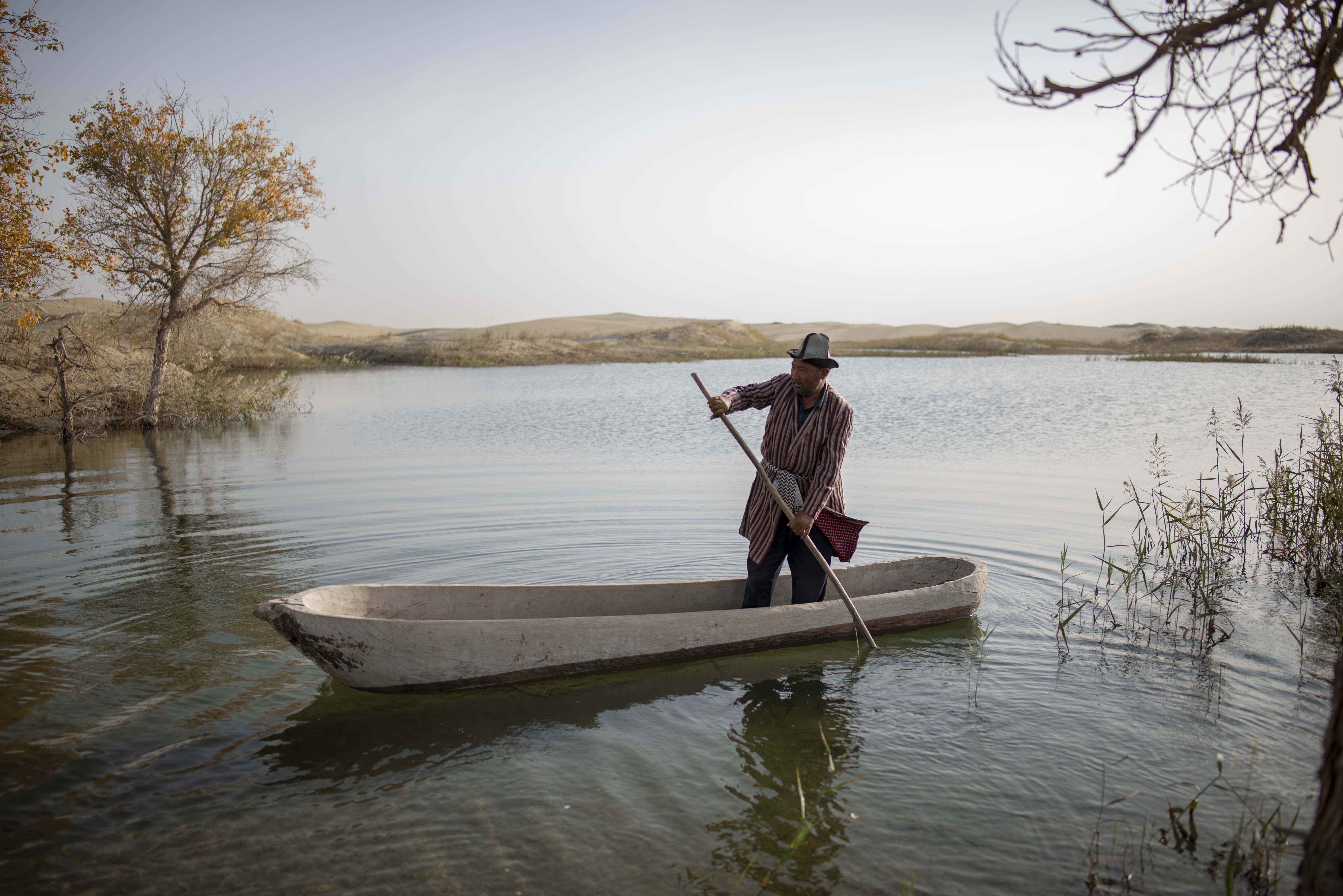 Amudun Abudu rows a canoe for fishing in Lop Nur People Village in Yuli County, northwest China's Xinjiang Uygur Autonomous Region. (Xinhua/Zhao Ge)